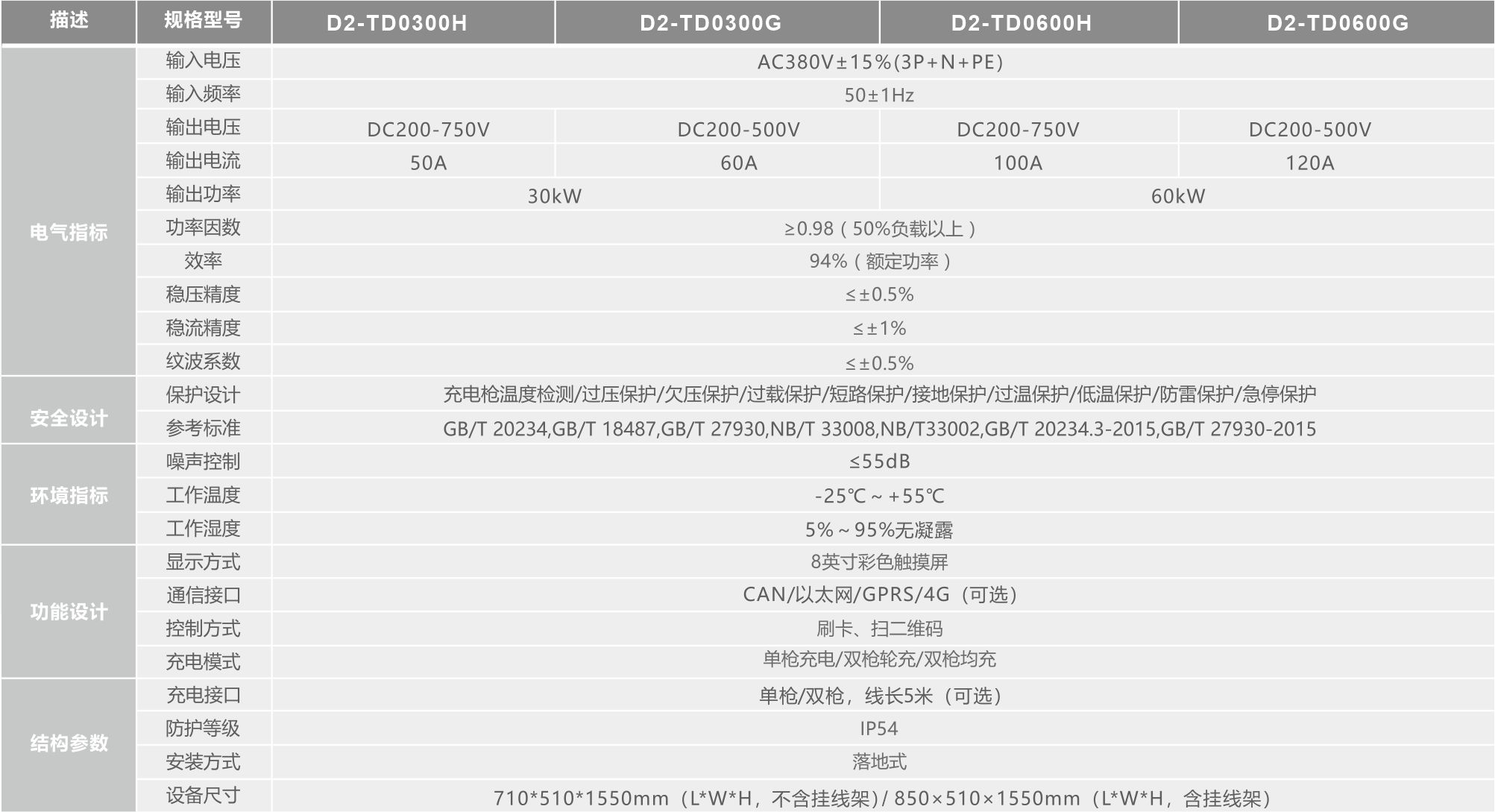 一體式直流樁 (30-60kW)一體式直流電樁適用于城市專用充電站(公交車、出租車、環(huán)衛(wèi)車、物流車、分時租賃電動車等)、城市公共充電站(面向社會車輛)、城際高速公路充電站等需要直流快速充電的場合。 產(chǎn)品集功率變換、充電控制、計量計費(fèi)等于一體,功率配置靈活,安裝方便,性能穩(wěn)定。產(chǎn)品系列涵蓋單槍輸出、雙槍輪充和均充、功率分配輸出等多種模式,是快速充電的理想設(shè)備。