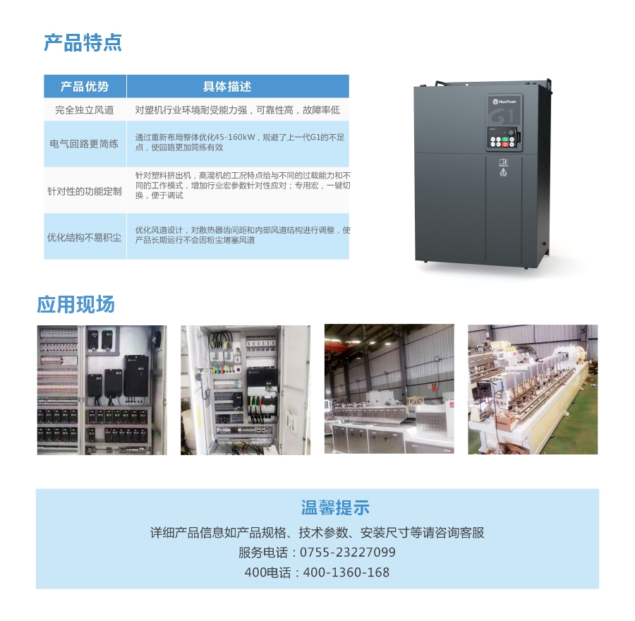 G1系列塑機(jī)專用變頻器G1系列塑機(jī)專機(jī)功率范圍:45kW-160kW,是針對(duì)塑料擠出機(jī)和高混機(jī)等特殊工況而研發(fā)的專用變頻器。環(huán)境適應(yīng)性強(qiáng),產(chǎn)品性能突出,優(yōu)勢(shì)明顯。